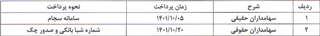 به اطلاع سهامداران محترم شرکت سهامی عام صنعتی کیمیدارو می رساند پرداخت سود نقدی مصوب مجمع عمومی عادی سالیانه مورخ ۱۴۰۱/۰۲/۳۱ مربوط به سال مالی منتهی به ۱۴۰۰/۱۲/۲۹ ، این شرکت به ازای هر سهم ۱۸۴۰ ریال، به سهامدارانی که در در زمان برگزاری مجمع مالک سهام بوده اند طبق جدول ذیل پرداخت خواهد شد.