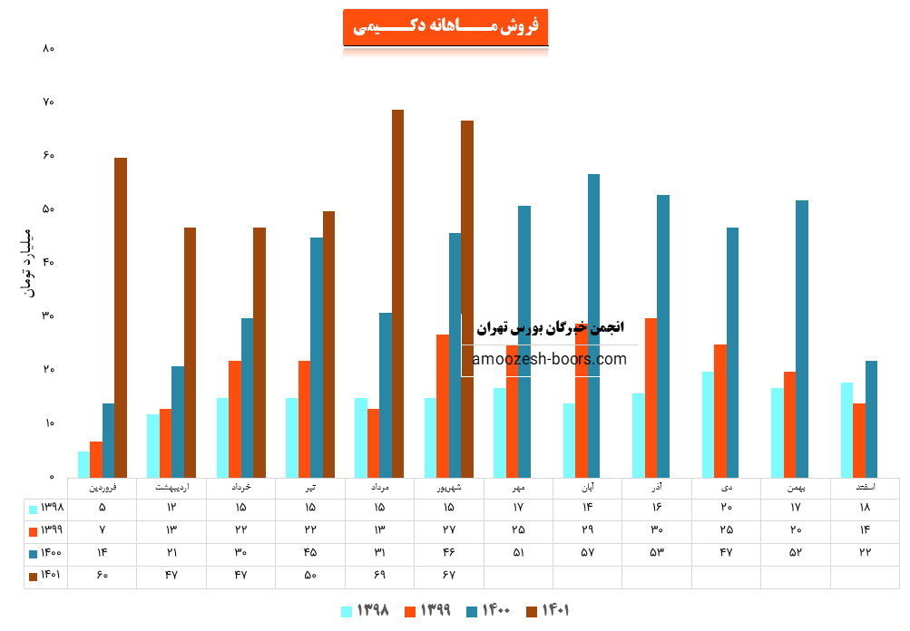 شرکت کیمیدارو با نماد دکیمی در اغاز 3ماهه دوم و در تیرماه 496 میلیارد ریال فروش زد که تمام از محل فروش داخلی است . این رقم نسبت به ماه گذشته 4 درصد تغییر و نسبت به مدت مشابه سال قبل 9 درصد تغییر و نسبت به میانگین ماه های سال جاری -5 درصد تغییر را تجربه نموده است .