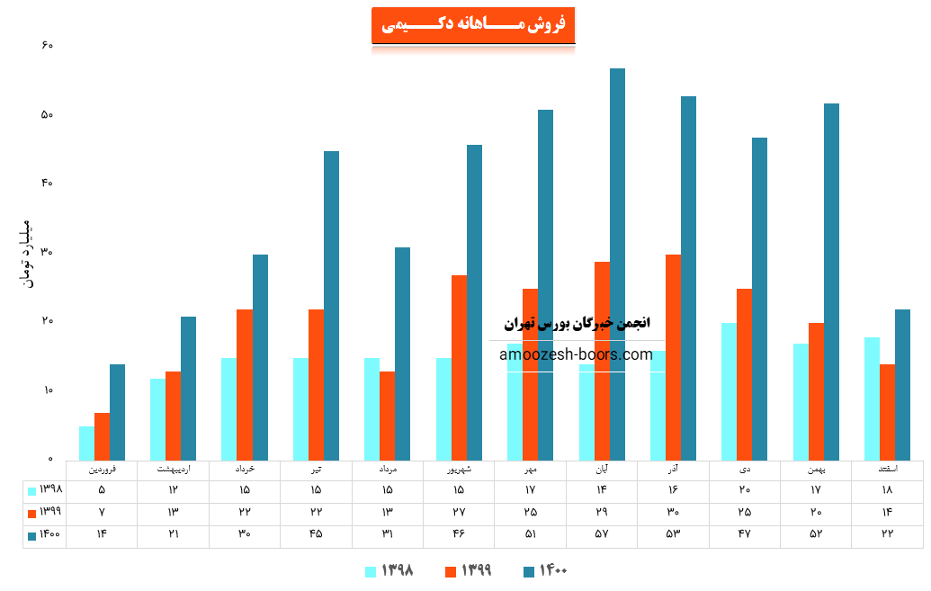 سهم دکیمی در اسفند ماه حدود بیش از 2/750/000 عدد از محصولات خود را به فروش رساند که این میزان در مقایسه با حجم فروش بهمن ماه حدود ۱۲ % رشد پیدا کرده است.