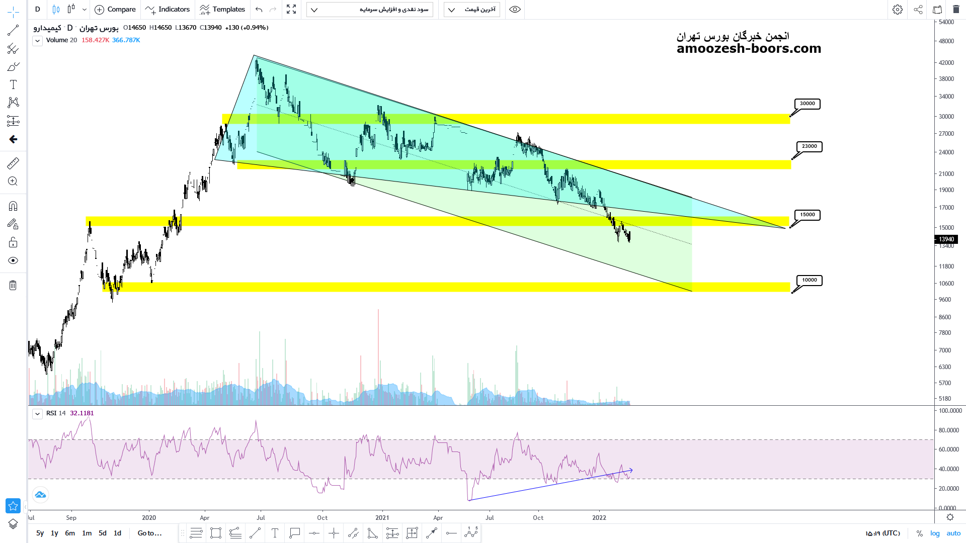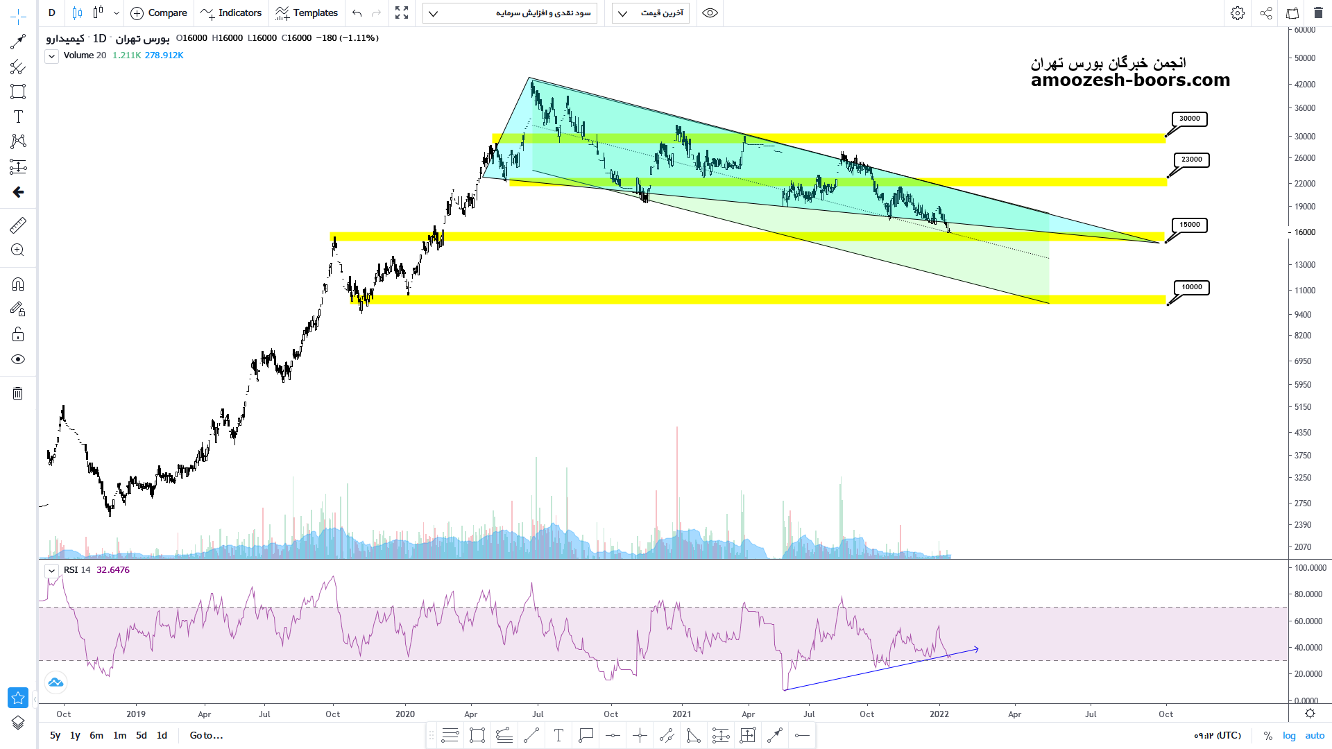 با توجه به عرضه زیاد و شکست حمایت مهم نماد دکیمی محدوده ۱۵۰۰ تومان قیمت پس از انجام پولبک به حمایت از دست رفته و تایید پولبک اکنون در حال اصلاح بیشتر میباشد. ما می توانیم محدوده حمایتی کف کانال نزولی که ترکیب آن با محدوده حمایت کلاسیک ای ۱۰۰۰ تومان که محدوده مهمی را برای ما به وجود می آورد را به عنوان مقصد این موج نزولی در نظر بگیریم که در صورت حمایت از این محدوده میتواند رشد ای را تا محدوده ی مقاومتی میدلاین کانال تجربه کند. اما در صورت رشد سه مقاومت مهم میدلاین کانال، محدوده کلاسیکی ۱۵۰۰تومان و کف الگوی شکسته شده را پیش روی خود خواهد داشت که باید برای رشد بیشتر ابتدا از سد این مقاومتها گذر کند.