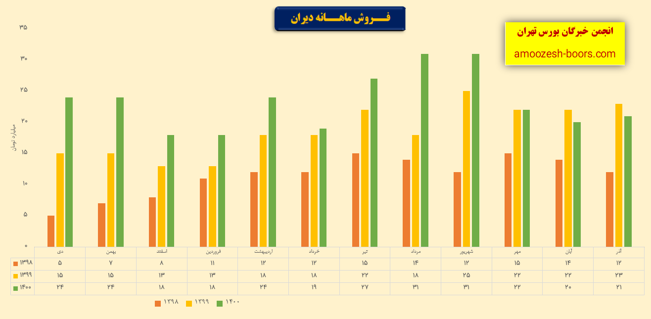 سهم دیران در آذر 1400 مبلغ 21 میلیارد تومان درامد داشته که این میزان نسبت به ماه گذشته بدون تغییر و همچنین نسبت به مدت مشابه سال گذشته 24% رشد درامد پیدا کرده است!