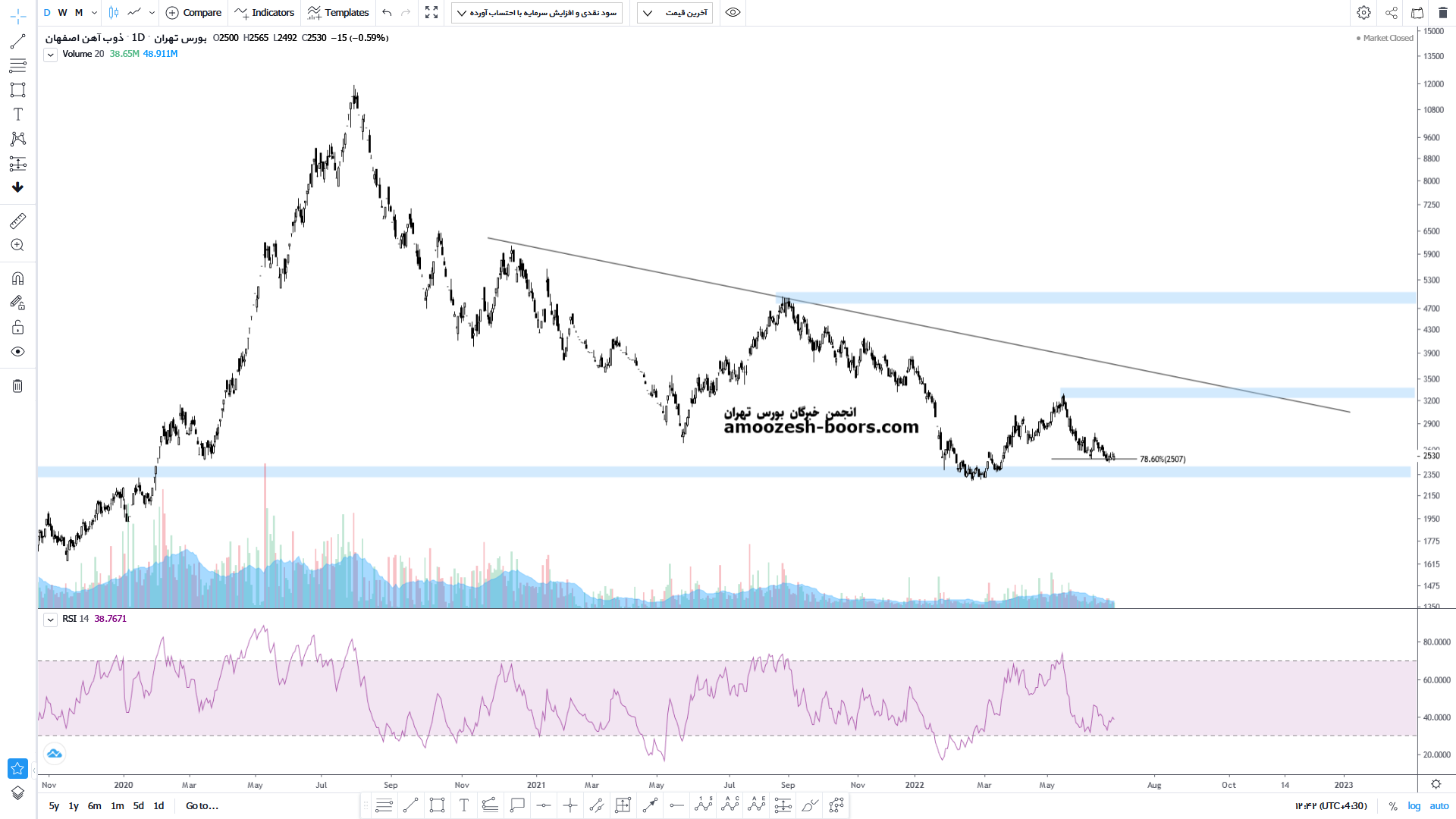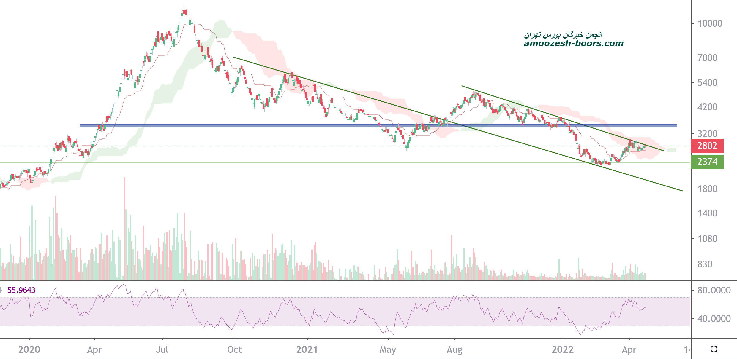 قیمت پس از اصلاح از محدوده ۳۳۰ تومان اکنون حمایت محدوده ۲۳۰ الی ۲۵۰ تومان را  پیش روی خود دارد که در صورت حمایت از این محدوده می‌تواند رشد خود را تا محدوده مقاومتی ۳۳۰ تومان که ترکیب آن با خط روند نزولی یک محدوده مقاومتی قوی برای قیمت به حساب می‌آید رشد کند در صورت شکستی محدوده مقاومتی نیز می‌تواند رشد خود را تا محدوده مقاومتی ۴۸۵ تومان نیز ادامه دهد.