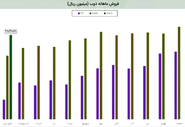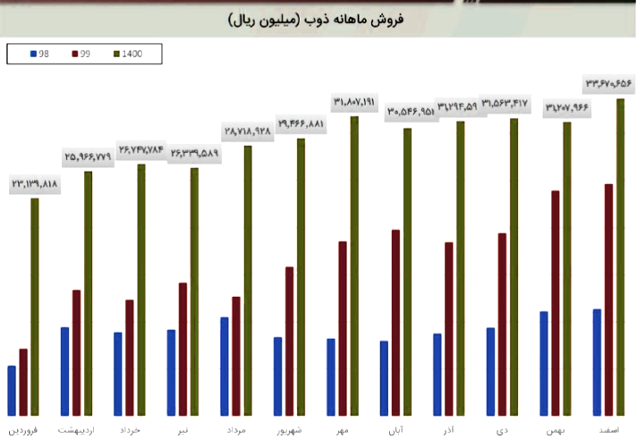 ذوب در اردیبهشت ماه به فروش 3427 میلیارد تومانی رسید که  (59%) درصد از درآمد شرکت درین ماه مربوط به فروش داخلی و (41%) درصد آن مربوط به کل صادرات شرکت است.