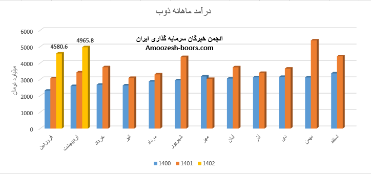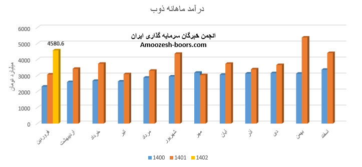 نماد ذوب در عملکرد ماهانه فروردین ماه سال 1402 به درآمد 4580.6 میلیارد تومانی دست یافته است، این رقم در مقایسه با مدت مشابه افزایش درخشان 49 درصدی را تجربه نموده است، 39% از فروش شرکت ذوب آهن اصفهان در این ماه از طریق فروش صادراتی تامین گردیده است، پر فروش ترین محصول سهم ذوب مربوط به تیر آهن میباشد، که در مقایسه با ماه گذشته تغییرات زیر را تجربه نموده است: