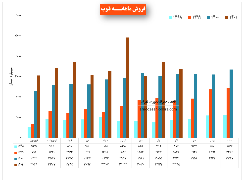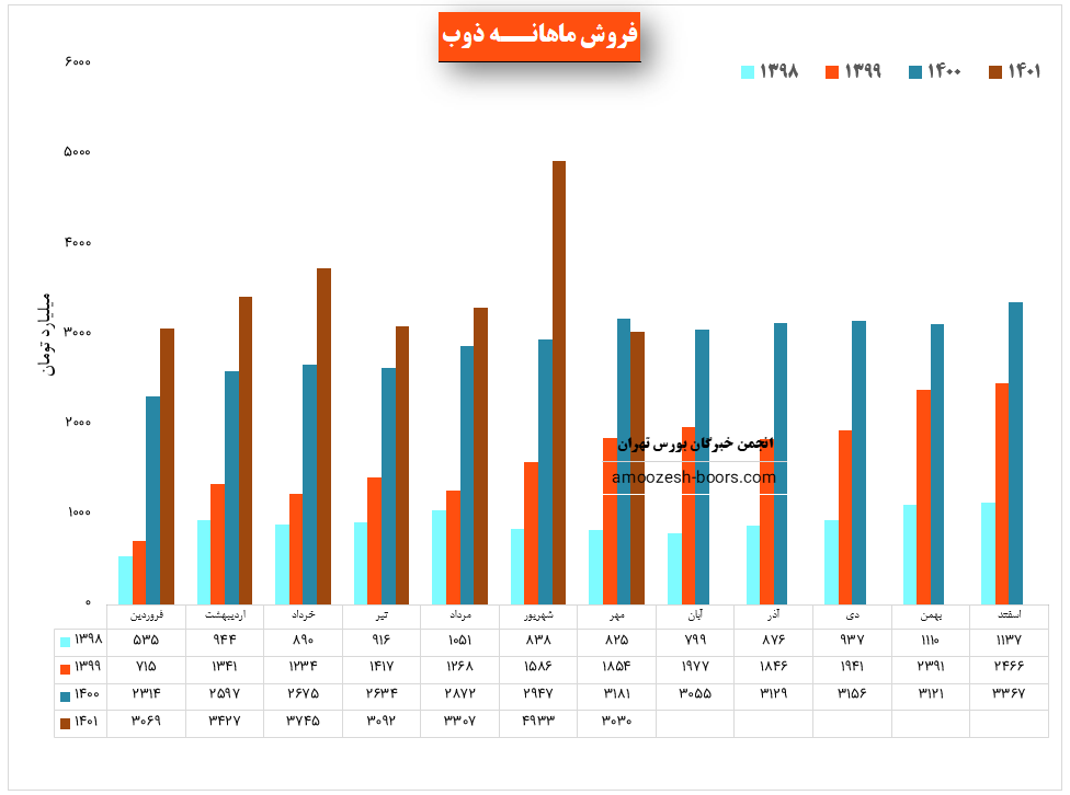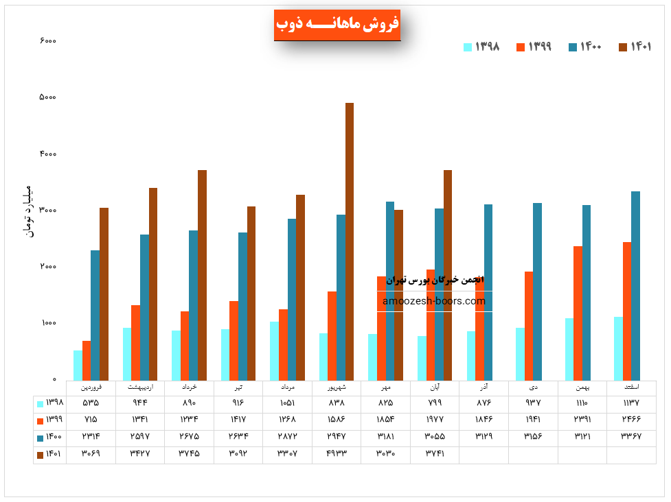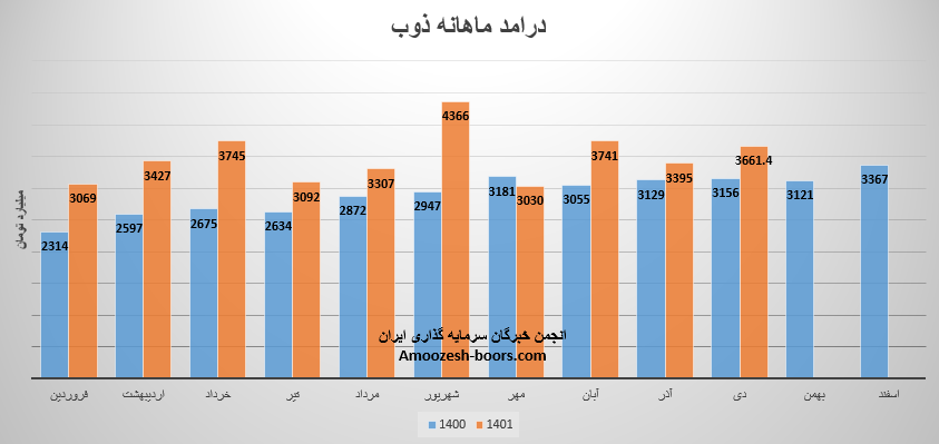 نماد ذوب (شرکت ذوب آهن اصفهان) در آذر ماه ۱۴۰1 حدود مبلغ 3395 میلیارد تومان درآمد داشته که این میزان در مقایسه با ماه گذشته 9 درصد افت و همچنین در مقایسه با مدت مشابه سال گذشته 9 درصد افزایش پیدا کرده است.
