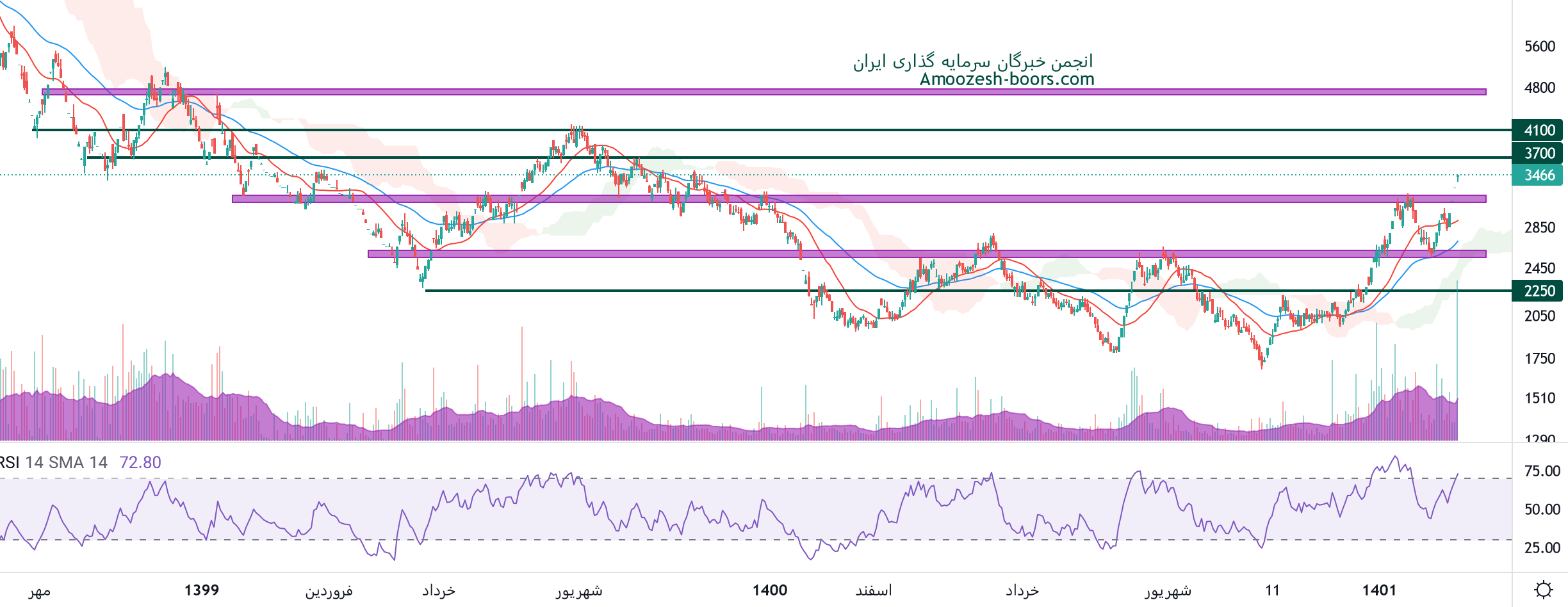 نماد ذوب حدود 100 درصد از کف رشد کرده، و در حال حاضر روند صعودی خود را حفظ کرده است، مقاومت 3700 و 4100 ریال پیش روی سهم میباشد، همچنین در صورت اصلاح، اولین حمایت سهم 3100 ریال در نظر گرفته خواهد شد.