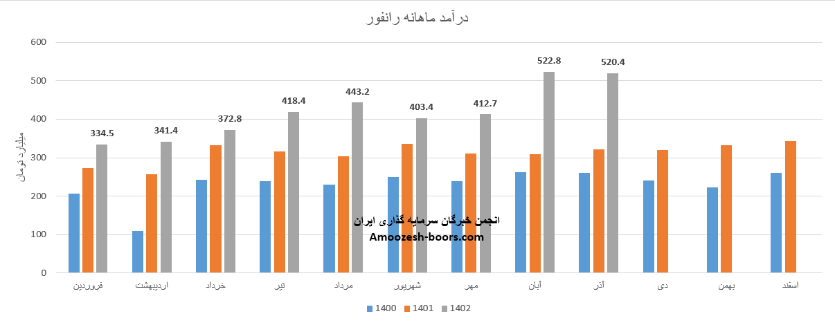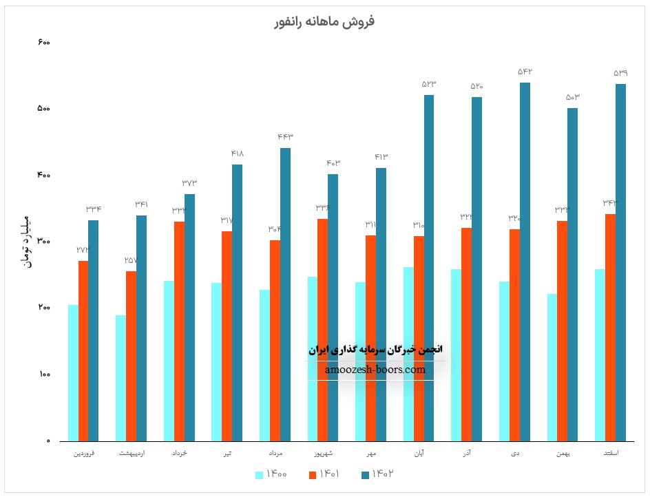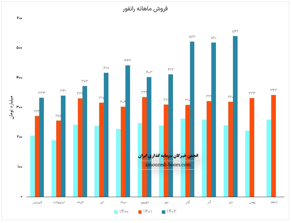 فروش آذر ماه سال 1402 سهم رانفور 520.4 میلیارد تومان گزارش شده است، تغییرات درآمدی رانفور به شرح زیر میباشد: