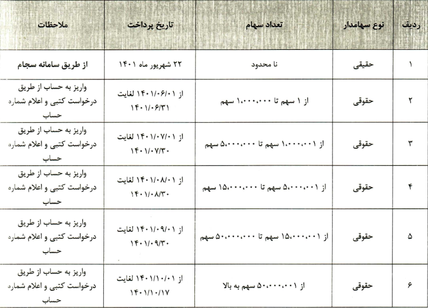بدینوسیله جدول زمانبندی پرداخت سود سهام عملکرد سال مالی منتهی به ۱۴۰۰/۱۲/۲۹ شرکت تجارت الکترونیک پارسیان ( سهامی عام) پس از تصویب مجمع عمومی عادی سالانه مورخ ۱۴۰۱/۰۲/۲۱ به شرح جدول پیوست سهم رتاپ تقدیم حضور می گردد. لذا سهامداران حقیقی محترمی که تا کنون ثبت نام خود را در سامانه سجام نهایی ننموده اند ضروریست به منظور دریافت سود سهام خود در اسرع وقت نسبت به ثبت نام و یا تکمیل مشخصات خود در سامانه سجام اقدام نمایند.