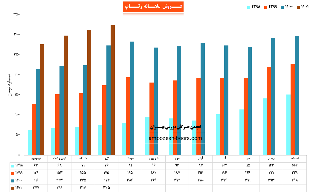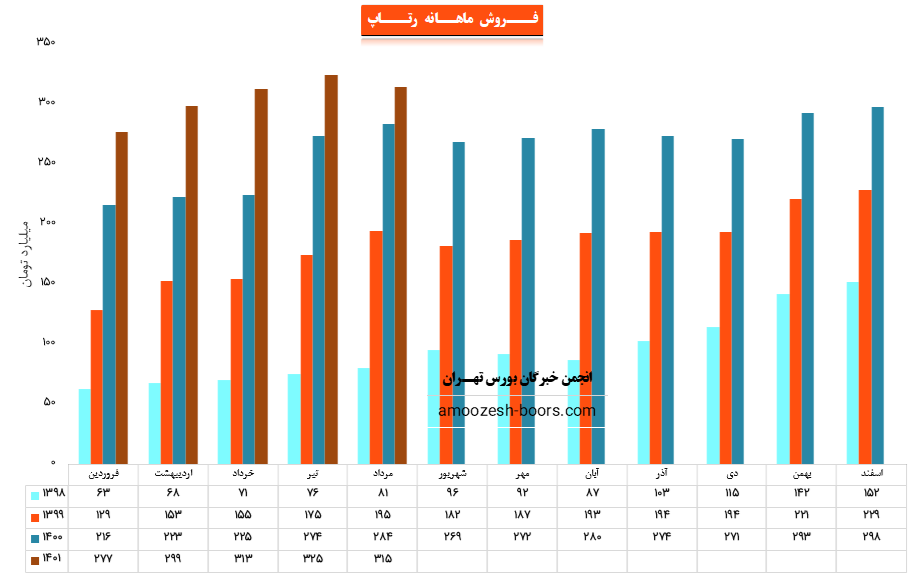 رتاپ درانتهای خرداد ماه معادل 3,128,913 میلیون ریال از محصولات خود را به فروش رسانده است که نسبت به ماه قبل 5% افزایش و نسبت به میانگین ماه های قبل 9% افزایش داشته است.