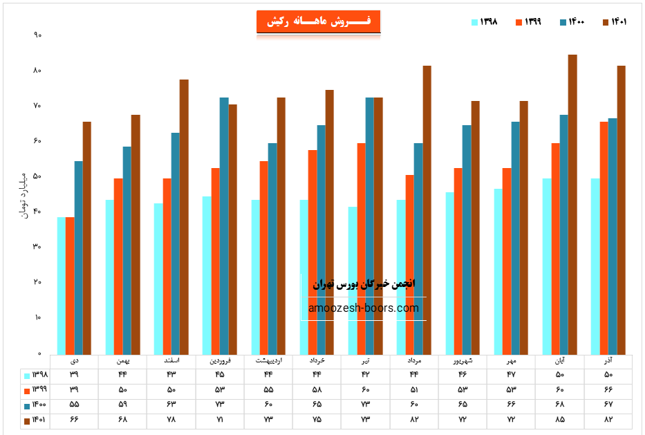 نماد رکیش (شرکت کارت اعتباری ایران کیش) در مهر ماه معادل 722,626 میلیون ریال از محصولات خود را به فروش رسانده است که نسبت به دوره 1 ماهه مشابه سال قبل 9% افزایش داشته است. درامد نماد رکیش نسبت به ماه قبل تفاوت چشمگیری نداشته و نسبت به میانگین ماهانه نیز افت یک درصدی را تجربه نموده است .همچنین مجموع درآمد رکیش طی عملکرد 10 ماهه سال مالی نیز نسبت به مدت مشابه سال قبل 65% رشد داشته است.