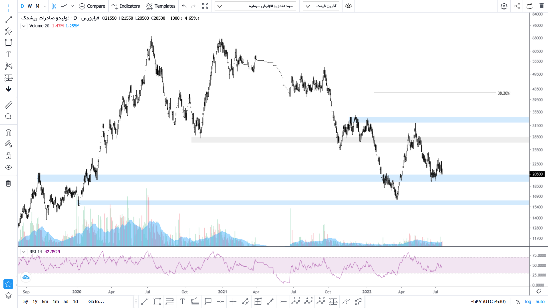 قیمت سهم ریشمک پس از برخورد به مقاومت مهم ناحیه 3200 تومان وارد فاز اصلاحی شده و اکنون نیز پس از برخورد به محدوده حمایتی 2000 تومان واکنش مثبتی را از خود بروز داده است. قیمت برای صعود مقاومت ناحیه 2850 تومان و درصورت شکست مقاومت ناحیه 3250 تومان را پیش روی خود دارد اما در صورت برگشت مجدد و شکست حمایت ناحیه 2000 تومان سیگنال خروج صادر و میتواند سهم ریشمک اصلاح خود را تا محدوده کف 1650 تومان نیز ادامه دهد.