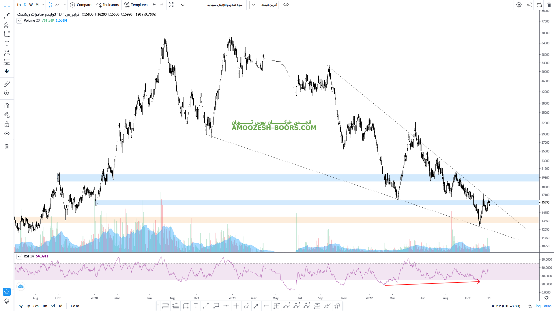 قیمت سهم ریشمک با ایجاد واگرایی مثبت میتواند پس از شکست خط روند نزولی خود و همچنین عبور از مقاومت ناحیه ۱۶۰۰ تومان رشد خود را تا مقاومت ناحیه 2000 تومان ادامه دهد اما در صورت بروز واکنش منفی نسبت به مقاومت ناحیه هزار،سیگنال خروج صادر و سهم ریشمک ۶۰۰ تومان قیمت میتوانند مجدداً کف حمایتی ۱۳۰۰ تومان را تست کند.