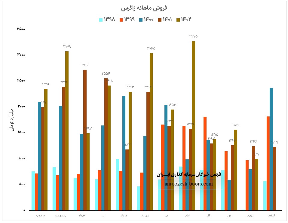 نماد زاگرس در اسفند ماه از طریق فروش داخلی به فروش 1866.8 میلیارد تومانی دست یافت، که 92% از این رقم را از طریق صادرات و مابقی را از طریق فروش داخلی به فروش رسانده است.