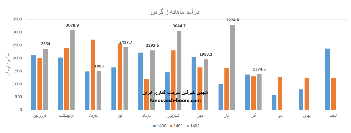 فروش آذر ماه سال 1402 سهم زاگرس 1374.6 میلیارد تومان گزارش شده است که از این درآمد 8% آن از محل فروش داخلی و مابقی از طریق فروش صادراتی بوده است، تغییرات درآمدی زاگرس به شرح زیر میباشد: