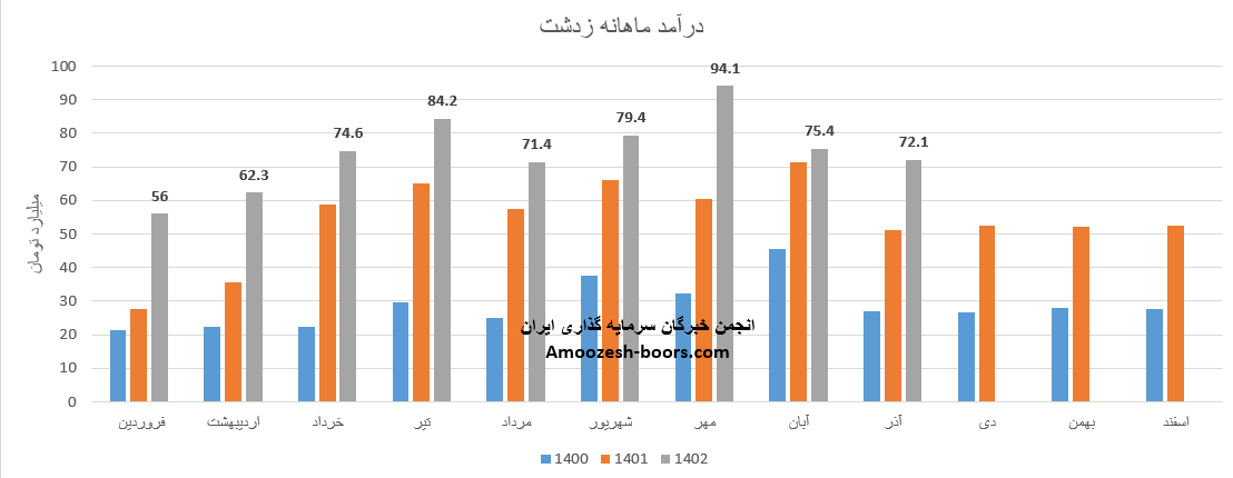 درآمد محقق شده نماد زدشت طی دوره فعالیت ماهانه به 79.4 میلیارد تومان رسید که در مقایسه با ماه گذشته 11% و نسبت به متوسط ماهانه 14% رشد داشته است، فروش ماهانه سهم زدشت ( دخمردره ) افزایش 20 درصدی داشته است.