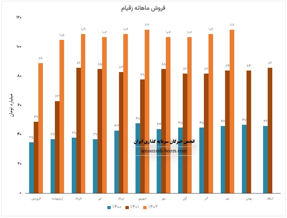 شرکت کشت و دام قیام اصفهان ( زقیام ) در بهمن ماه 1402 فروش 110 میلیارد تومانی را به دست آورده که کاهش 2 درصدی در مقایسه با ماه گذشته و همچنین رشد 3 درصدی نسبت به متوسط ماهانه داشته است،