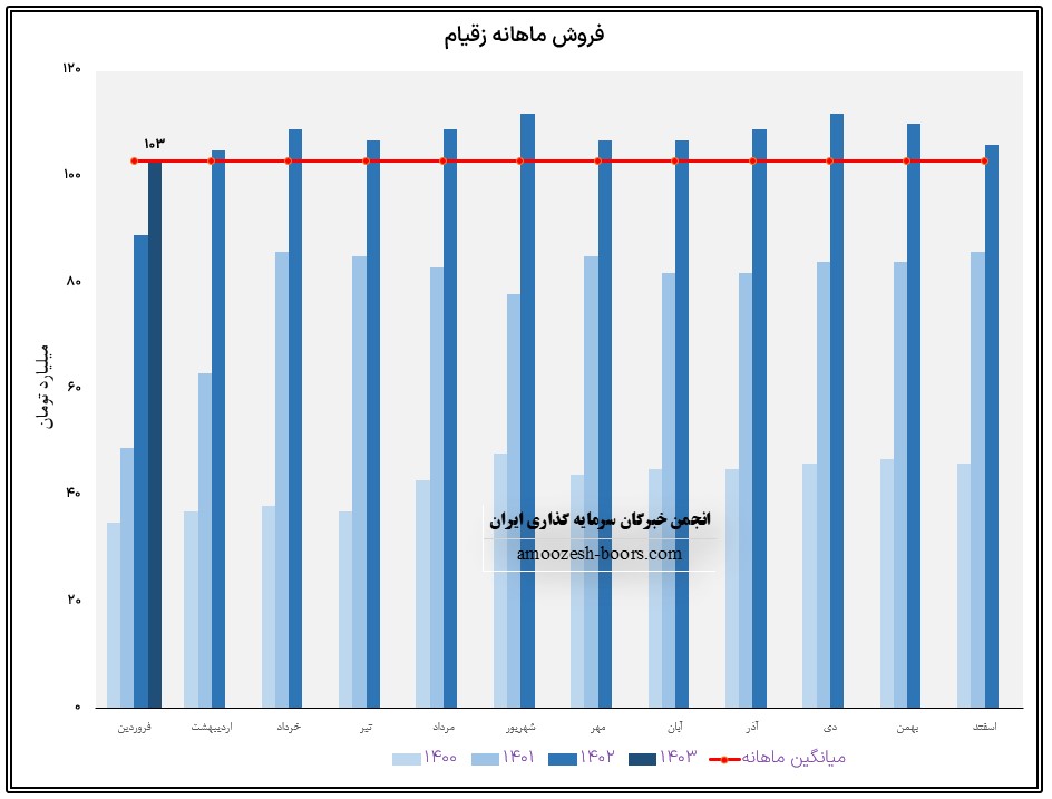 نماد زقیام (شرکت کشت و دام قیام اصفهان) در فروردین ماه 1403 حدود مبلغ 103 میلیارد تومان درآمد داشته که این میزان در مقایسه با ماه گذشته 3% افت و همچنین در مقایسه با مدت مشابه سال گذشته 16% رشد پیدا کرده است.