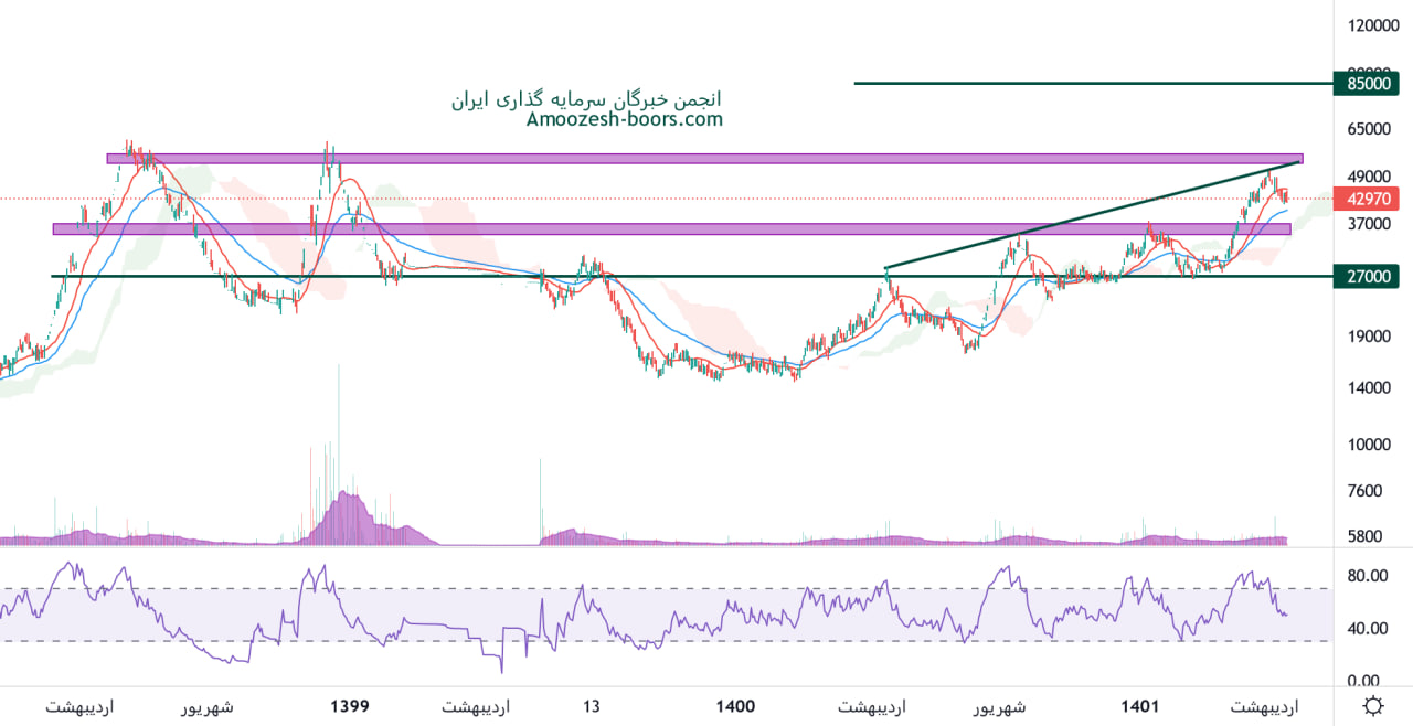 قیمت سهم زمگسا بر روی حمایت ناحیه کف کانال صعودی قرار گرفته است. لذا در صورت حفظ این ناحیه پر قدرت، اولین مقاومت سهم زمگسا ناحیه 5300 تومان و در صورت شکست مقاومت بعدی سهم زمگسا ناحیه سقف کانال صعودی یعنی ناحیه 6700 تومان در نظر گرفته خواهد شد.