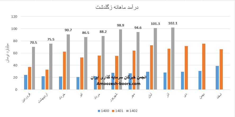 فروش آذر ماه سال 1402 سهم زگلدشت 102.1 میلیارد تومان گزارش شده است، تغییرات درآمدی زگلدشت به شرح زیر میباشد: