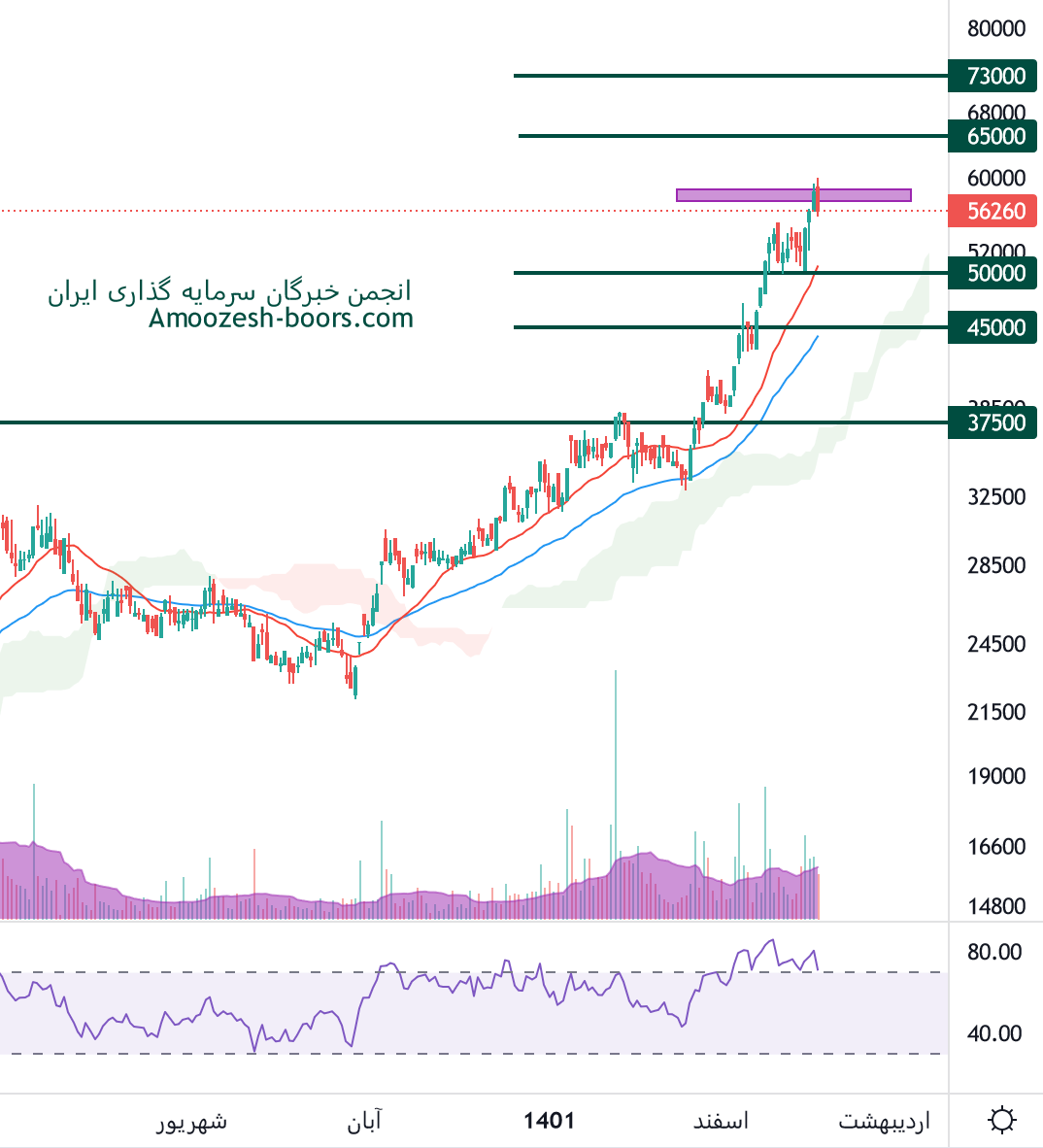 قیمت نماد ستران تارگت 60000 ریال را تست کرده و چارت از ریسک بالایی برخوردار میباشد، در صورت بروز نشانه های اصلاحی مثل ایجاد کندل قوی برگشتی اقدام به سیو سود نمایید، مقاومت های سهم ستران به ترتیب 65000 و 73000 ریال در نظر گرفته خواهند شد، همچنین حمایت های سهم 50000 و 45000 ریال خواهند بود.