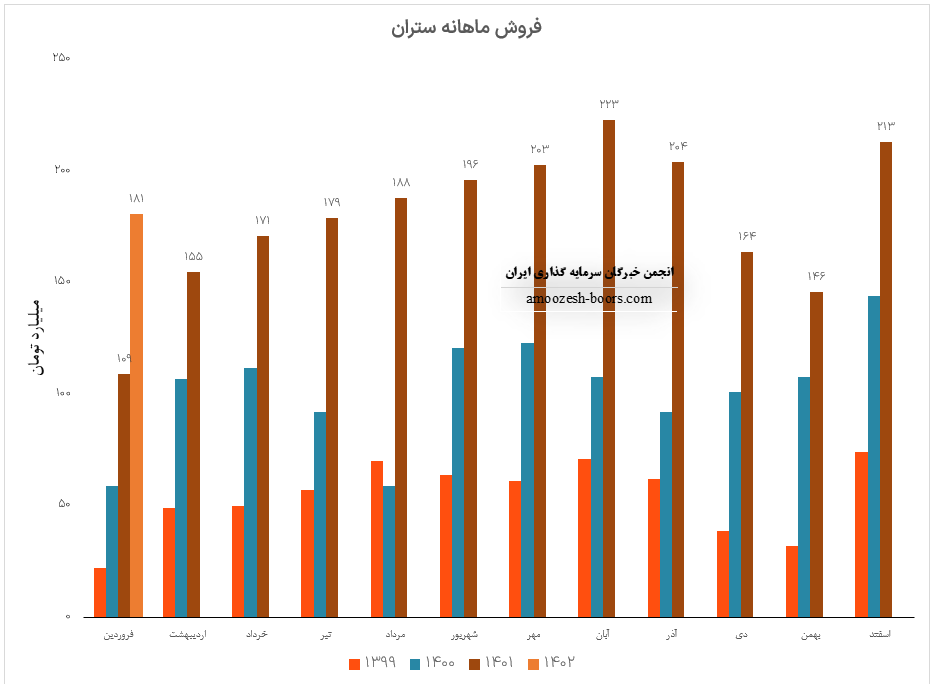 نماد ستران در فروردین ماه حدود بیش از 220 هزار تن از محصولات خود را به فروش رسانده که این میزان در مقایسه با حجم فروش ماه گذشته خود حدود 27% کاهش پیدا کرده است.