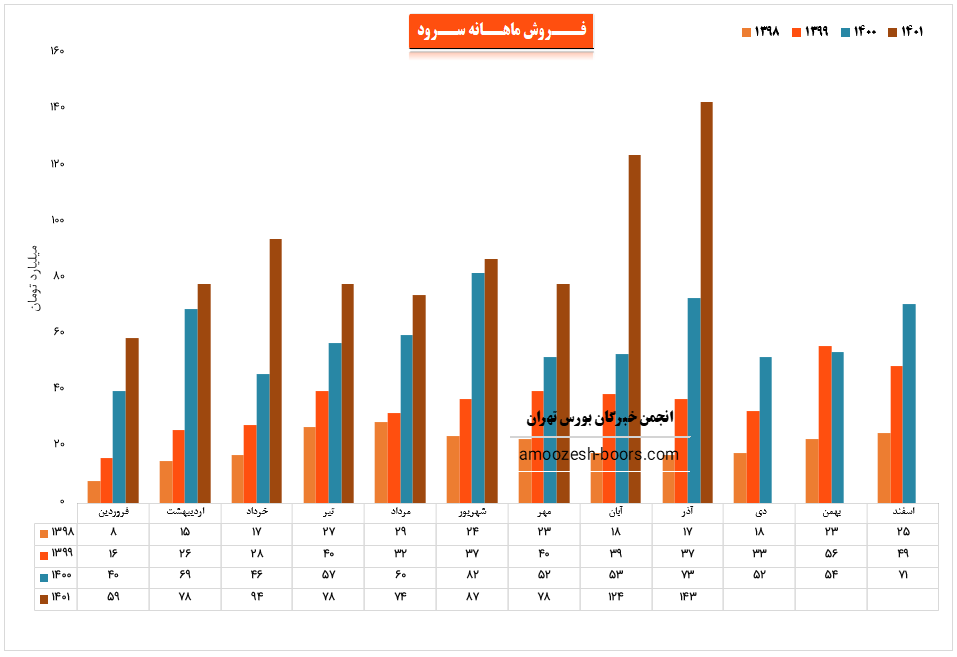 نماد سرود (شرکت سیمان شاهرود) در آذر ماه ۱۴۰1 حدود مبلغ 143 میلیارد تومان درآمد داشته که این میزان در مقایسه با ماه گذشته 15% و همچنین در مقایسه با مدت مشابه سال گذشته 96% رشد پیدا کرده است.