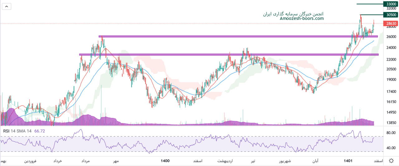 نماد سرود بعد از حرکت خوبی که داشته، برای بار دوم به محدوده مقاومتی 30500 ریال نزدیک شده، در صورت ادامه دار شدن تقاضا و عبور از این سطح مقاومتی، حرکت سهم سرود تا محدوده 33000 ریال دور از ذهن نخواهد بود، همچنین در صورت اصلاح، اولین حمایت 26000 ریال ارزیابی خواهد شد.
