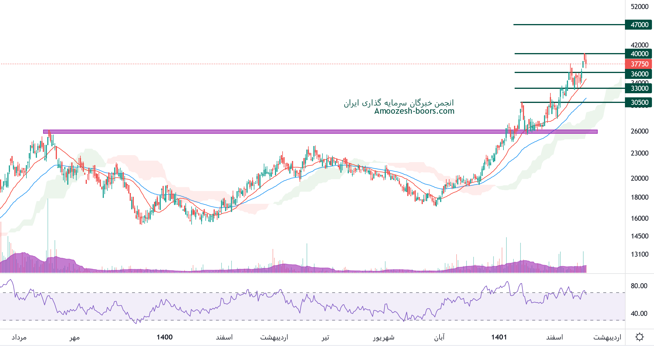 نماد سرود پس از شکست مقاومت تاریخی خود تارگت عدد رند 40000 ریال را تست نموده است، روند حرکتی سهم سرو صعودی بوده و حمایت 36000 ریال و مقاومت 47000 ریال را بر سر راه خود دارد.