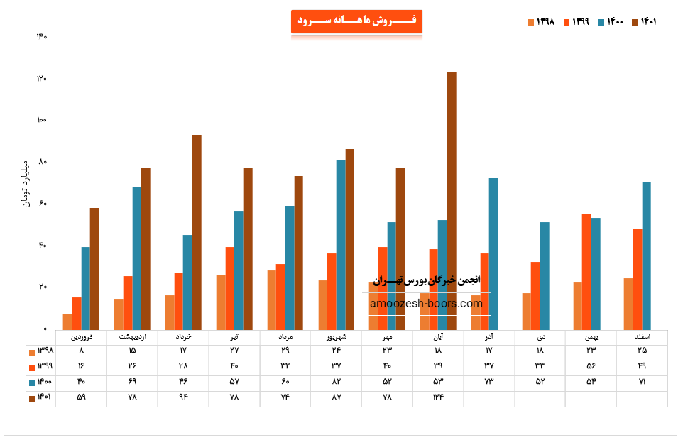 نماد سرود (شرکت سیمان شاهرود) در آبان ماه ۱۴۰1 حدود مبلغ ۱۲۴ میلیارد تومان درآمد داشته که این میزان در مقایسه با ماه گذشته ۵۹% و همچنین در مقایسه با مدت مشابه سال گذشته ۱۳۴% رشد درآمد پیدا کرده است.