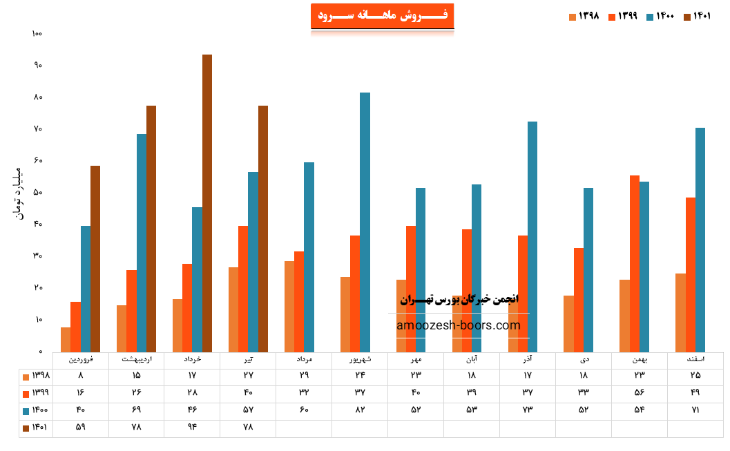 سرود در اردیبهشت فروش فوقالعاده 783 میلیارد ریالی را ثبت کرده است. (60%) درصد از درآمد شرکت درین ماه مربوط به فروش داخلی و (40%) درصد آن مربوط به کل صادرات شرکت است.