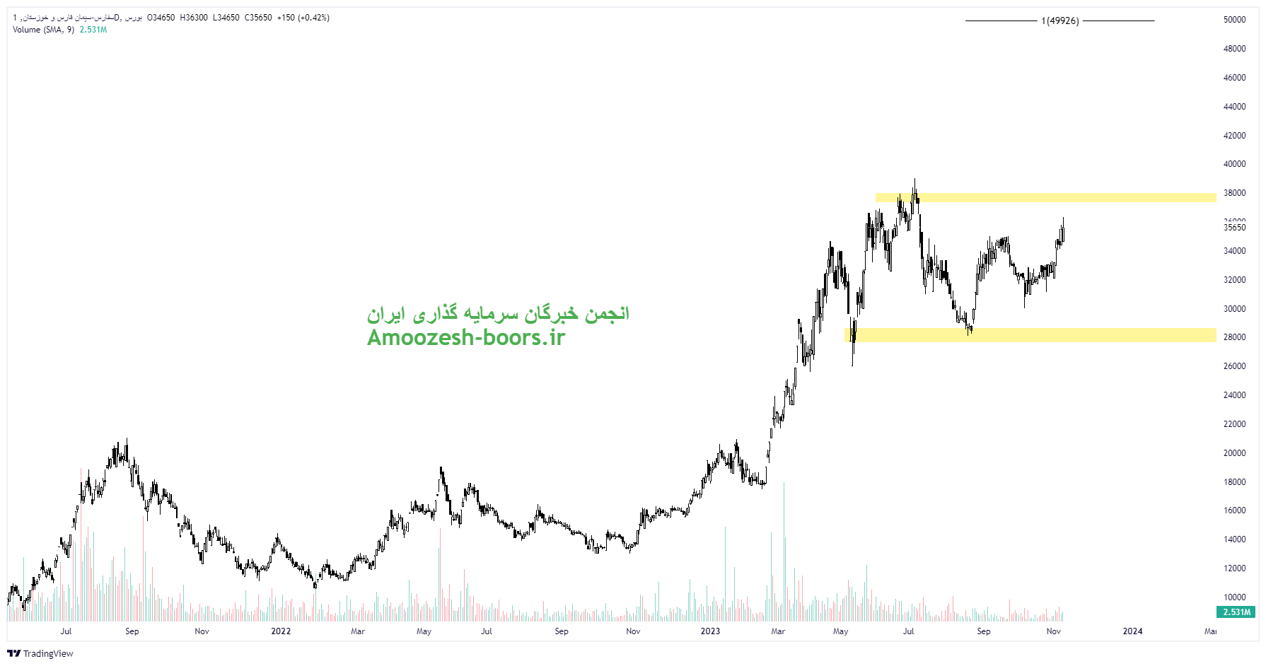 قیمت نماد سفارس در حال حرکت به سمت سقف کانال صعودی در محدوده 40000 ریال میباشد، در صورت عبور قیمت سهم سفارس از این محدوده مقاومتی، مقاومت بعدی سفارس 50000 ریال خواهد بود، همچنین در صورت ورود قیمت به فاز اصلاحی اولین حمایت سهم 28000 ریال در نظر گرفته خواهد شد.