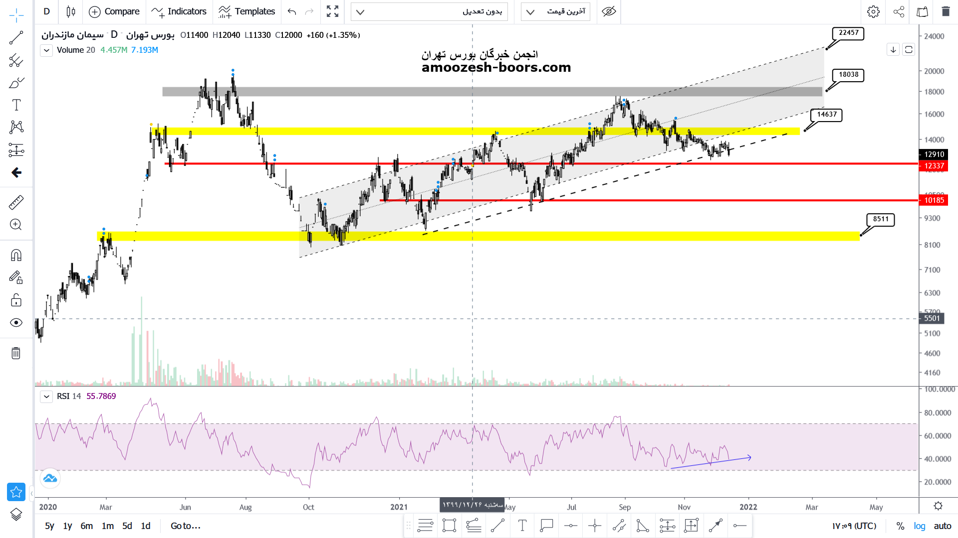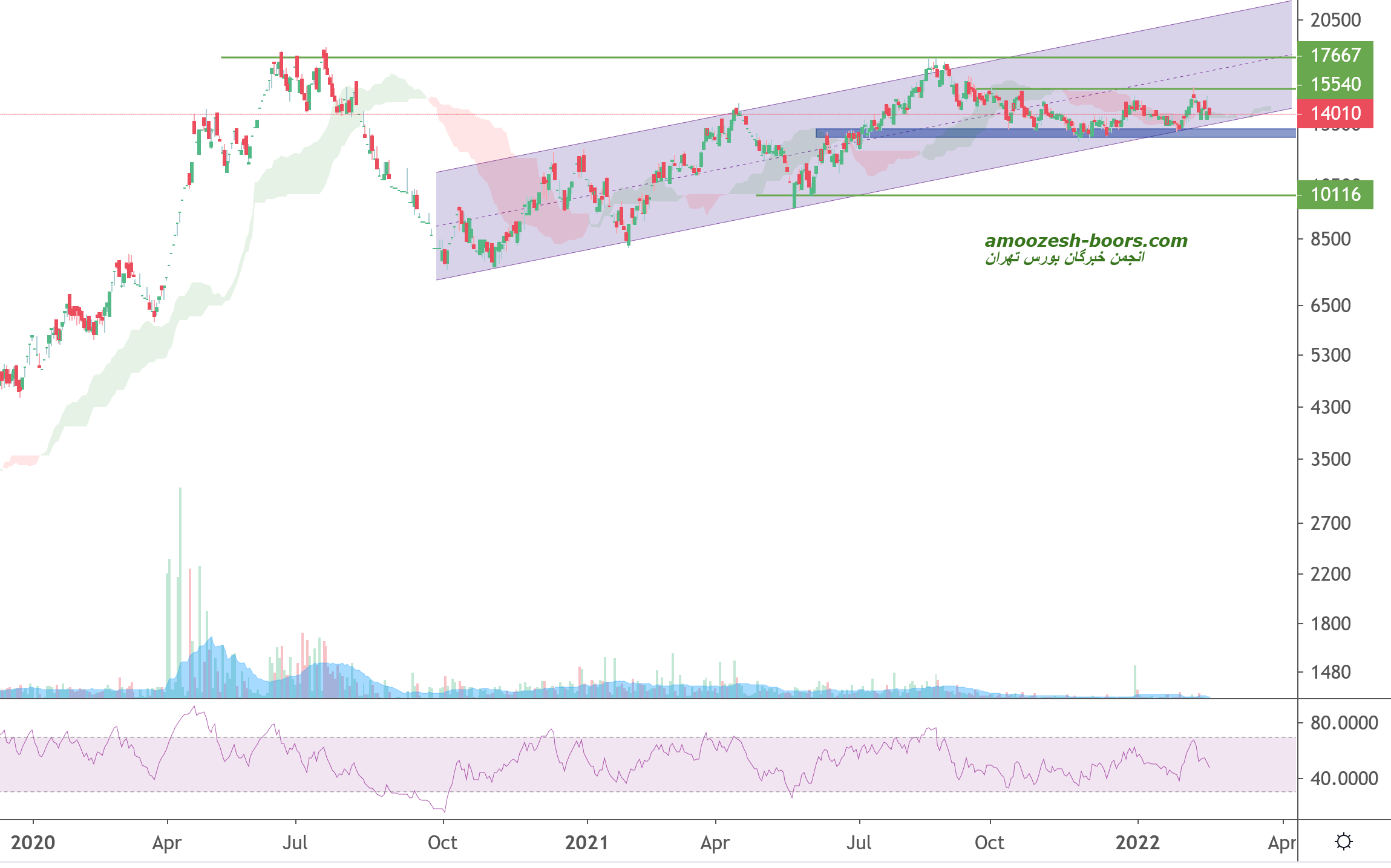 انتظار میرود پساز برخورد قیمت به محدوده مقاومتی 1450 تا محدوده حمایتی 1250 و 1000 اصلاح ادامه پیدا کند و درصورت بازگشت قیمت به کانال انتظار رشد بیشتر تا محدوده 18000 از سهم میرود