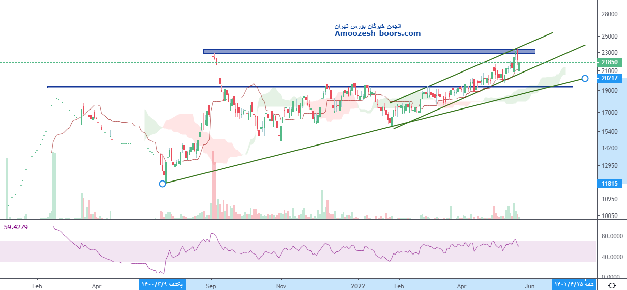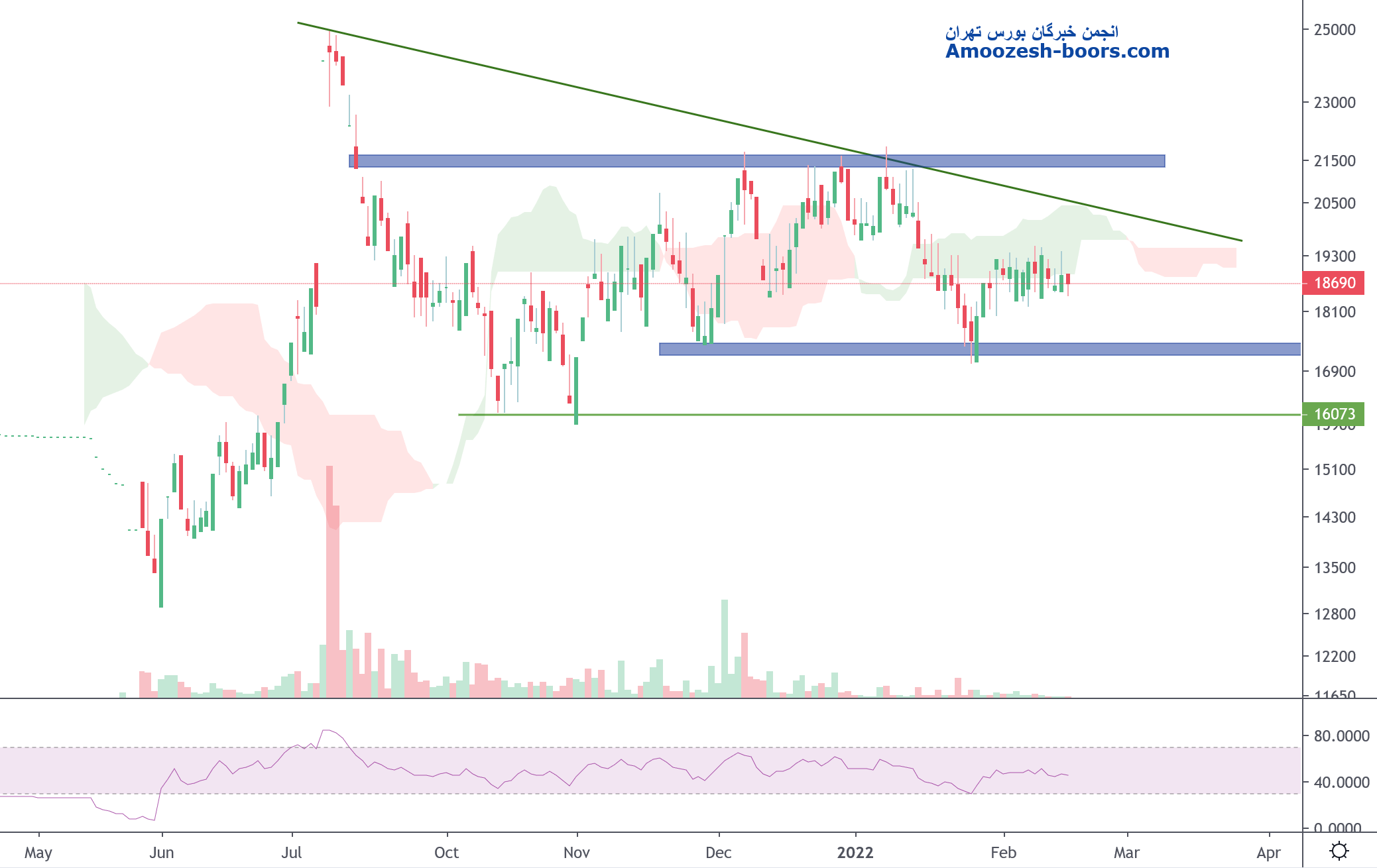 قیمت در حال حاضر در حال نوسان بین دو محدوده حمایت و مقاومت استاتیک خود میباشد،در صورت ادامه صعود اولین تارگت سهم مقاومت داینامیک و روانی عدد رند 20000 ریال خواهد بود و در صورت از دست رفتن کف حمایتی نزول سهم تا حمایت استایتک و روانی عدد رند 16000 ریال محتمل خواهد بود.