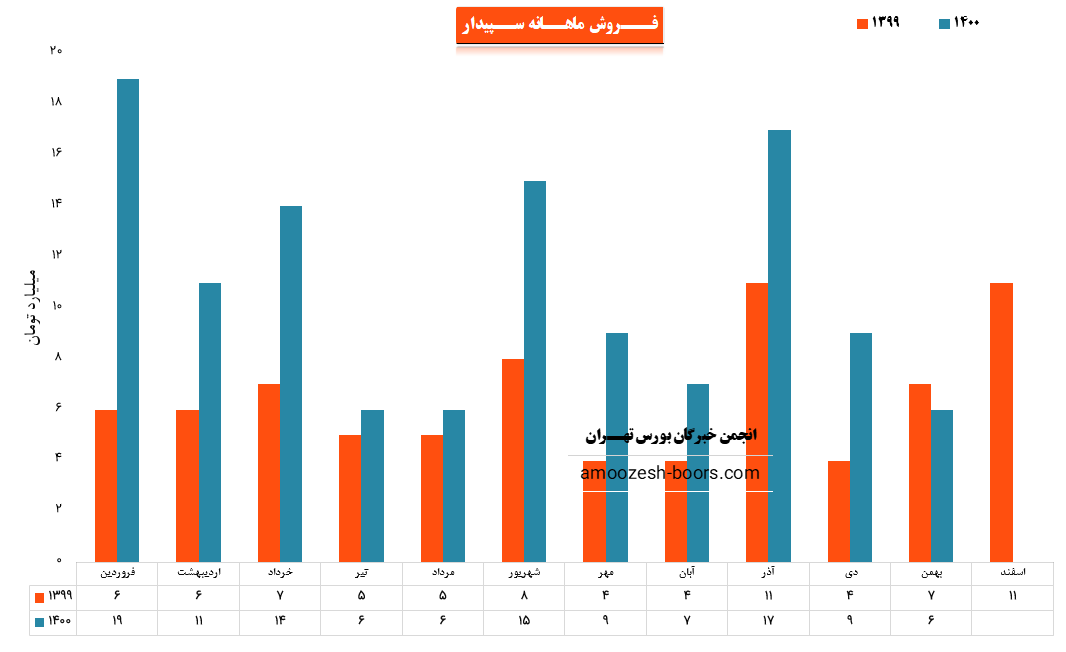 سپیدارمعادل 281,978 میلیون ریال از محصولات خود را به فروش رسانده است که نسبت به دوره 1 ماهه مشابه سال قبل 49% افزایش داشته است.