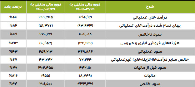 درآمد دو ماهه امسال رشد 53% نسبت به مدت مشابه سال گذشته دارد. متوسط درآمد ماهانه سال مالی گذشته شرکت برابر 12 میلیارد تومان بوده است.