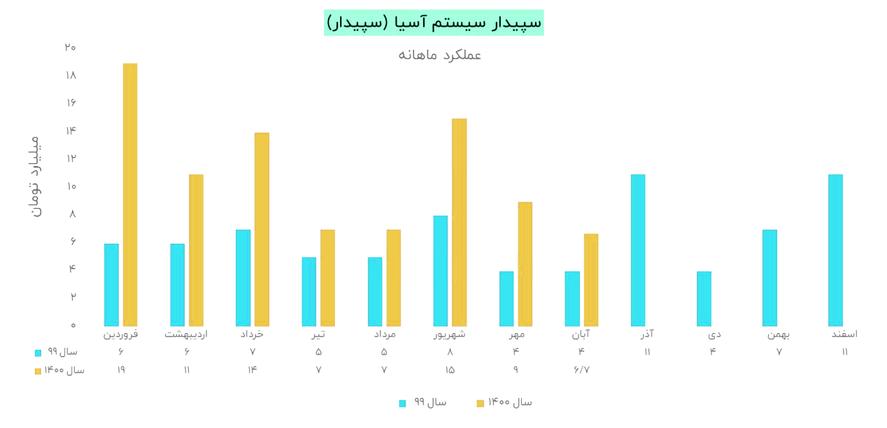 شرکت سپیدار سیستم آسیا طی عملکرد 1 ماهه منتهی به 1400/08/30 معادل 67,066 میلیون ریال از محصولات خود را به فروش رسانده که نسبت به دوره 1 ماهه مشابه سال قبل 54% افزایش داشته است و 8 ماهه به عدد 875 میلیارد ریالی رسیده است . مبلغ گزارش شده مربوط به دو سرفصل درآمد پشتيباني و فروش نسخه هاي جديد بروز رسانی شده نرم افزار، مربوط به دوره سالانه منتهي به ۲۹ اسفند سال ۱۴۰۰ مي باشد. فروش راهکارهاي مذکور و صدور صورتحساب براي مشتريان عمدتا در ماه هاي اول سال صورت مي گيرد.
