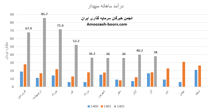 فروش آذر ماه سال 1402 سهم سپیدار 38 میلیارد تومان گزارش شده است، تغییرات درآمدی سپیدار به شرح زیر میباشد:
