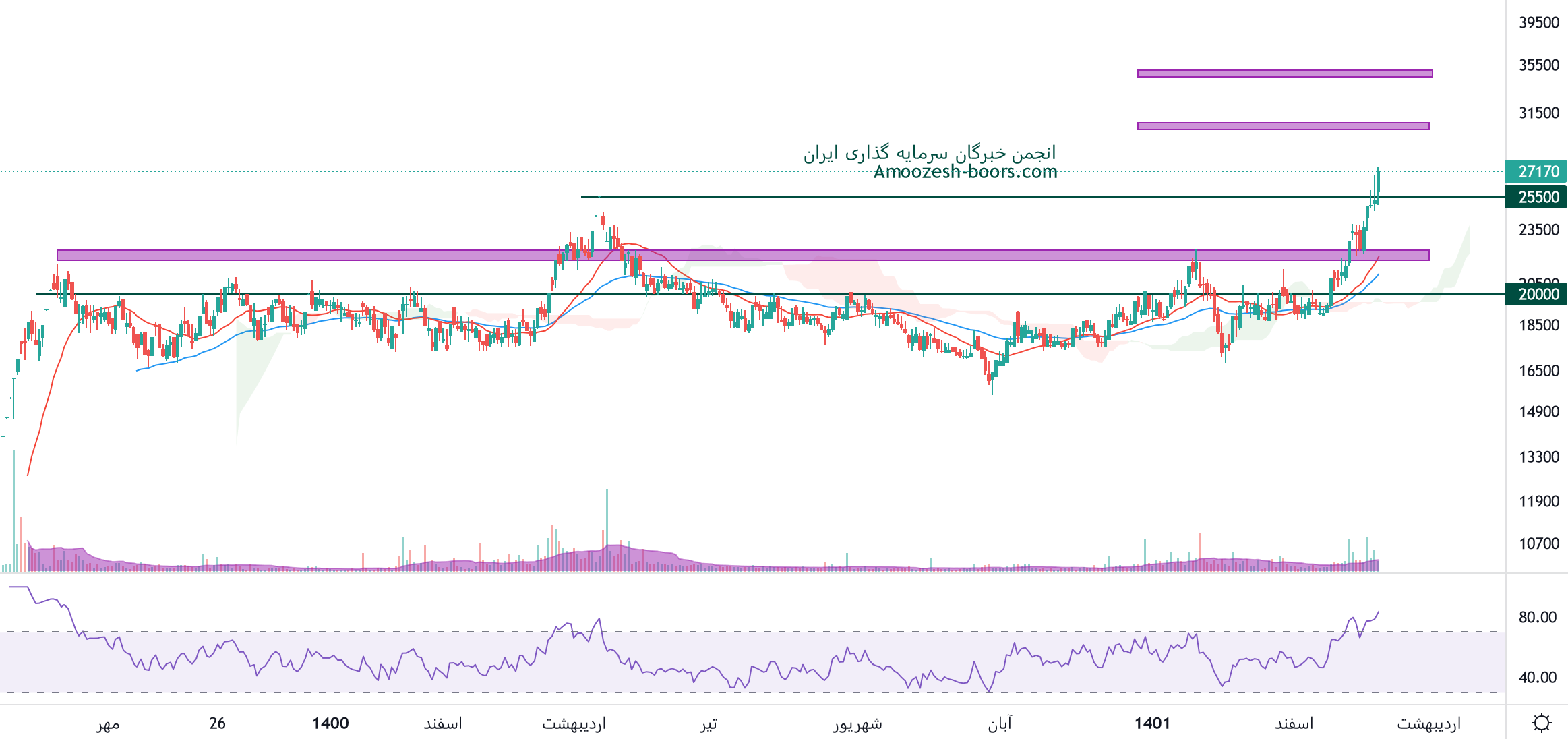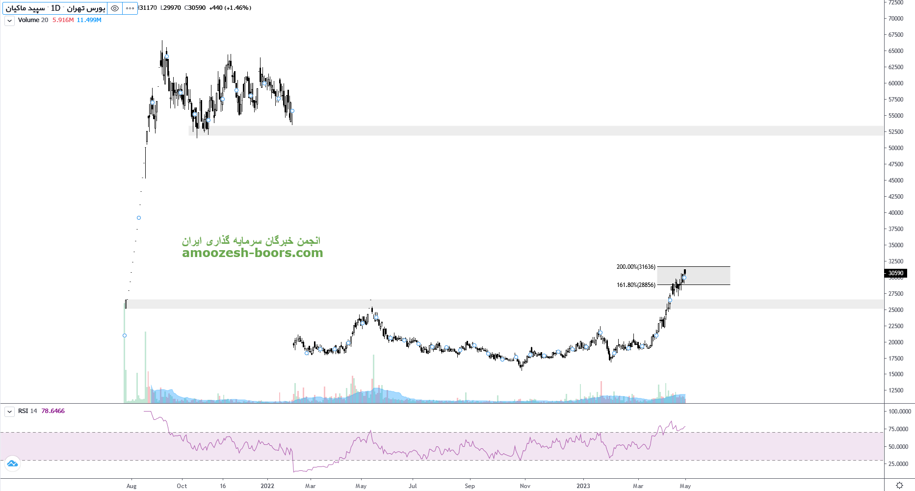 قیمت سهم سپید بر روی مقاومت ناحیه 3200 تومان قرار گرفته است. در صورتی که قیمت بتواند از این ناحیه عبور کند مقاومت مهمی پیش روی خود ندارد و لذا می تواند در صورت مهیا بودن شرایط خوب در بازار رشد خود را تا مقاومت ناحیه ۵۳۰۰ تومان نیز ادامه دهد. همچنین در صورت تمایل قیمت به اصلاح اولین حمایت سهم ناحیه ۲۵۰۰ تومان تلقی خواهد شد.