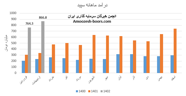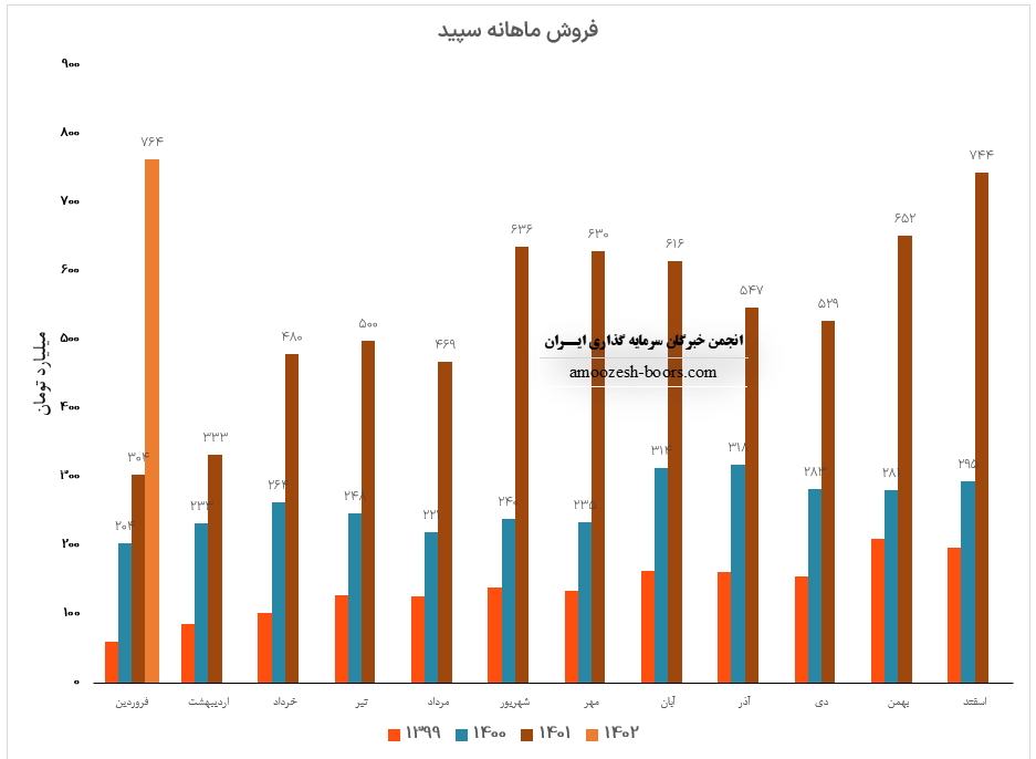 نماد سپید (شرکت سپید ماکیان) در فروردین ماه 1402 حدود مبلغ 764 میلیارد تومان درآمد داشته که این میزان در مقایسه با ماه گذشته 3% و همچنین در مقایسه با مدت مشابه سال گذشته 151% رشد پیدا کرده است.