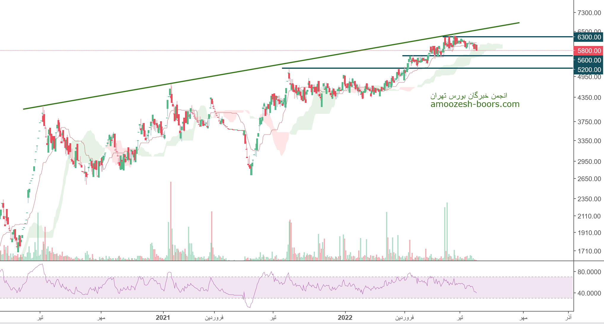سیستم در حال حاضر حمایت 5600 ریال را دارا میباشد، در صورت تثبیت قیمت، حرکت سهم تا 6300 ریال دور از ذهن نخواهد بود، همچنین در صورت از دست رفتن این حمایت، حمایت بعدی 5200 ریال خواهد بود.
