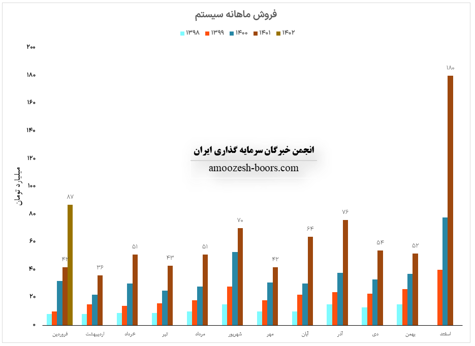 نماد سیستم (شرکت همکاران سیستم) در فروردین ماه 1402 حدود مبلغ 87 میلیارد تومان درآمد داشته که این میزان در مقایسه با ماه گذشته 52% افت و همچنین در مقایسه با مدت مشابه سال گذشته 107% رشد پیدا کرده است.