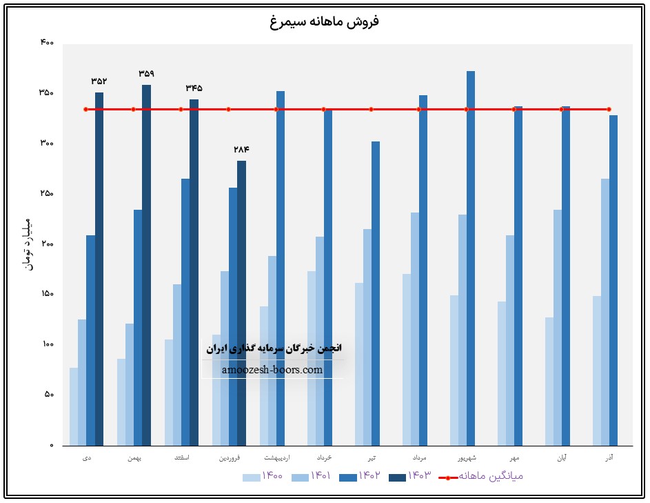 نماد سیمرغ (شرکت سیمرغ) در فروردین ماه 1403 حدود مبلغ 284 میلیارد تومان درآمد داشته که این میزان در مقایسه با ماه گذشته 18 درصد افت و همچنین در مقایسه با مدت مشابه سال گذشته 11% رشد پیدا کرده است.