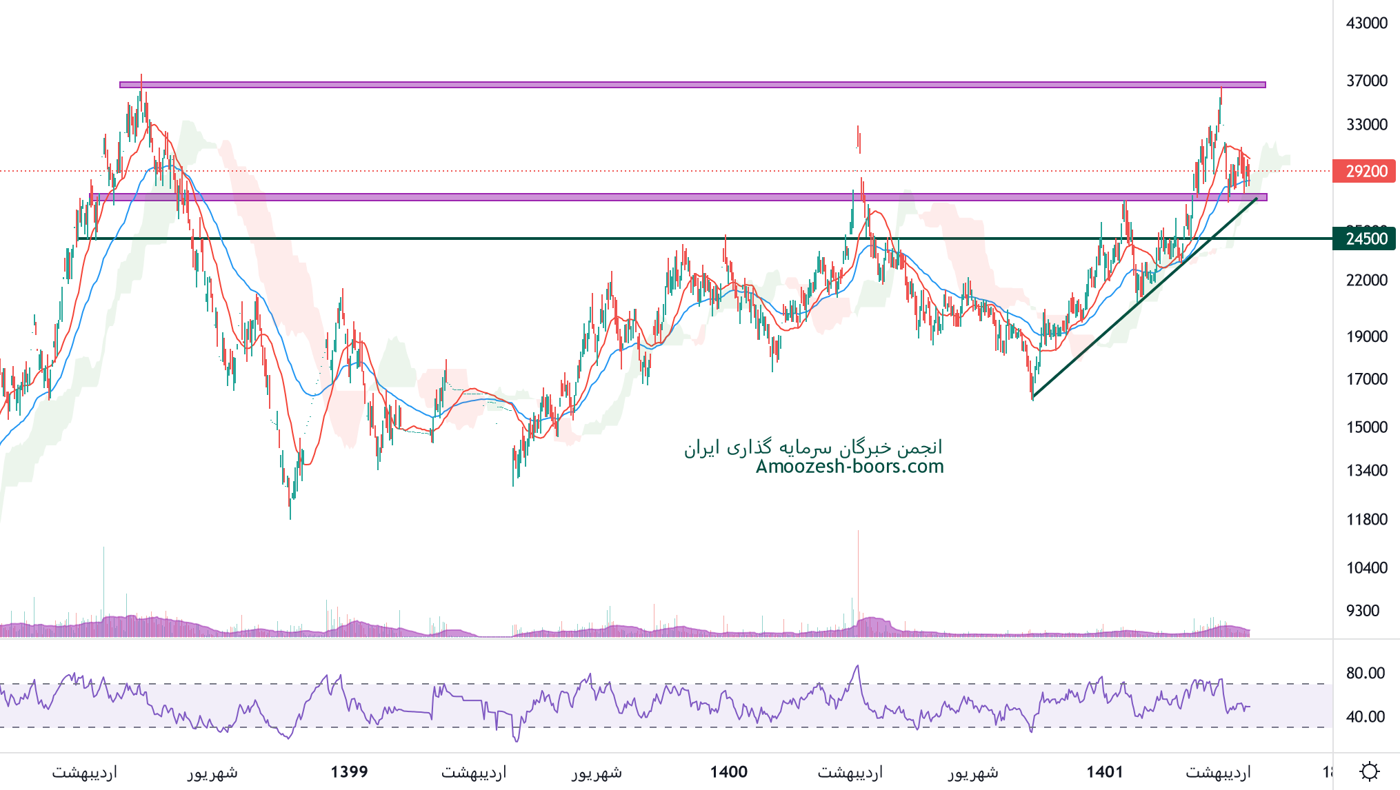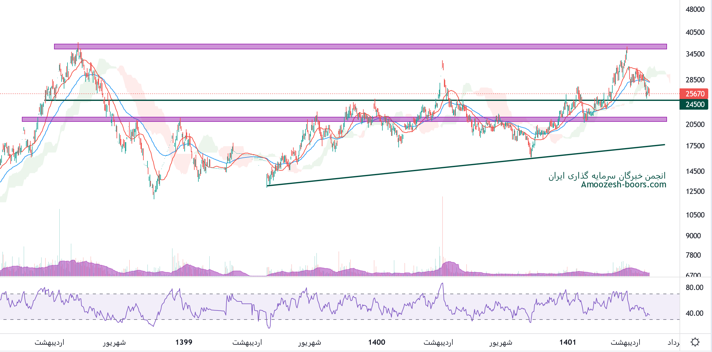 قیمت سهم سیمرغ پس از خروج از کانال نزولی کوتاه مدت و پولبک به آن، اکنون در حال حرکت به سمت مقاومت مهم ناحیه 3600 تومان میباشد. در صورت از دست رفتن تقاضا و حمایت ناحیه ۲۷۰۰ تومان حمایت بعدی سهم سیمرغ ناحیه ۲۲۰۰ تومان تلقی خواهد شد.