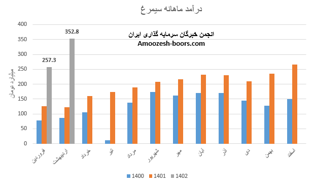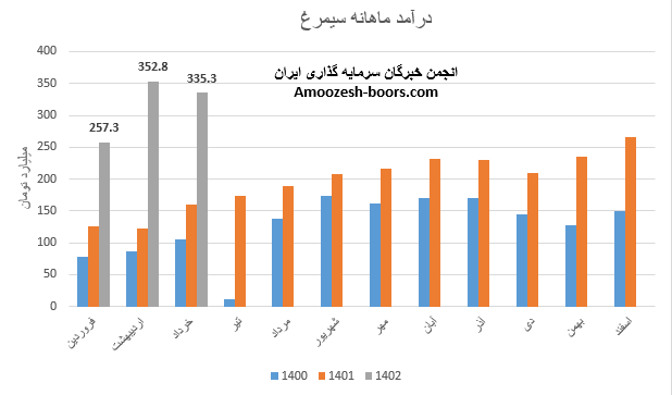 نماد سیمرغ (شرکت سیمرغ) در تیر ماه 1402 حدود مبلغ 303 میلیارد تومان درآمد داشته که این میزان در مقایسه با ماه گذشته 10% افت و همچنین در مقایسه با مدت مشابه سال گذشته 74% رشد پیدا کرده است.