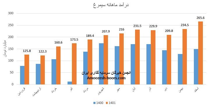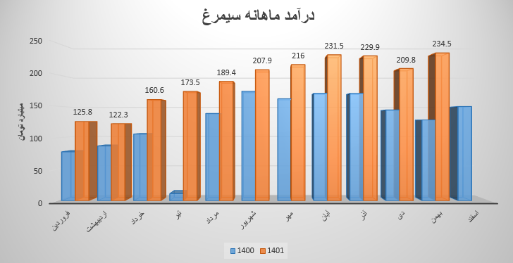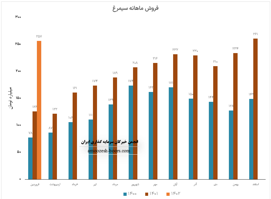 نماد سیمرغ (شرکت سیمرغ) در فروردین ماه 1402 حدود مبلغ 257 میلیارد تومان درآمد داشته که این میزان در مقایسه با ماه گذشته 2% افت و همچنین در مقایسه با مدت مشابه سال گذشته 104% رشد پیدا کرده است.