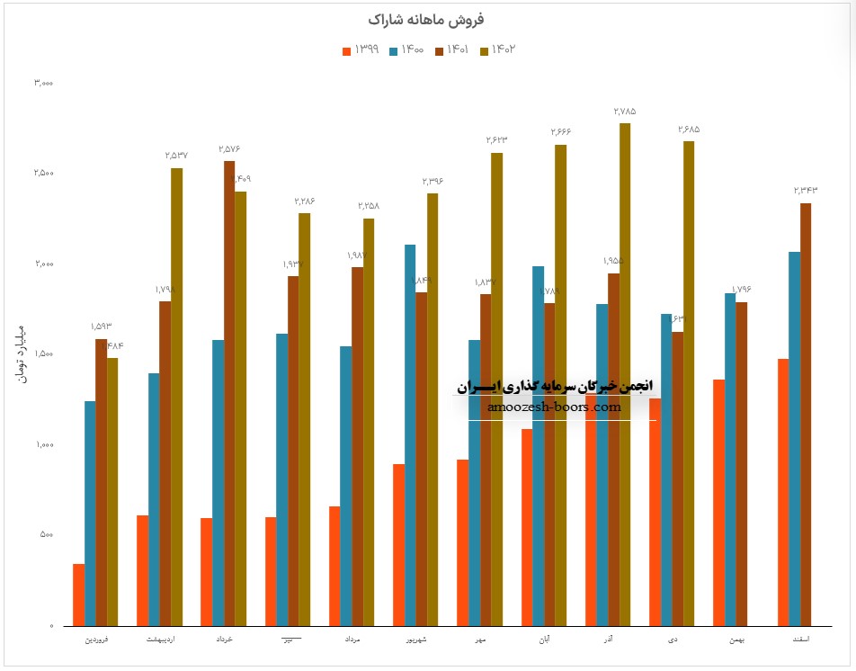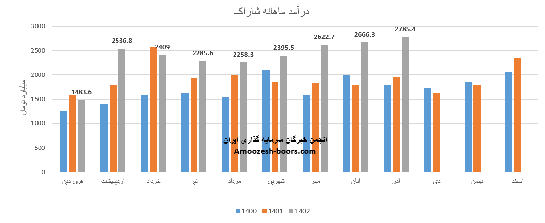فروش آذر ماه سال 1402 سهم شاراک 2785.4 میلیارد تومان گزارش شده است که 66% از این رقم از طریق فروش داخلی و مابقی از طریق صادرات تامین گردیده است، تغییرات درآمدی شاراک به شرح زیر میباشد: