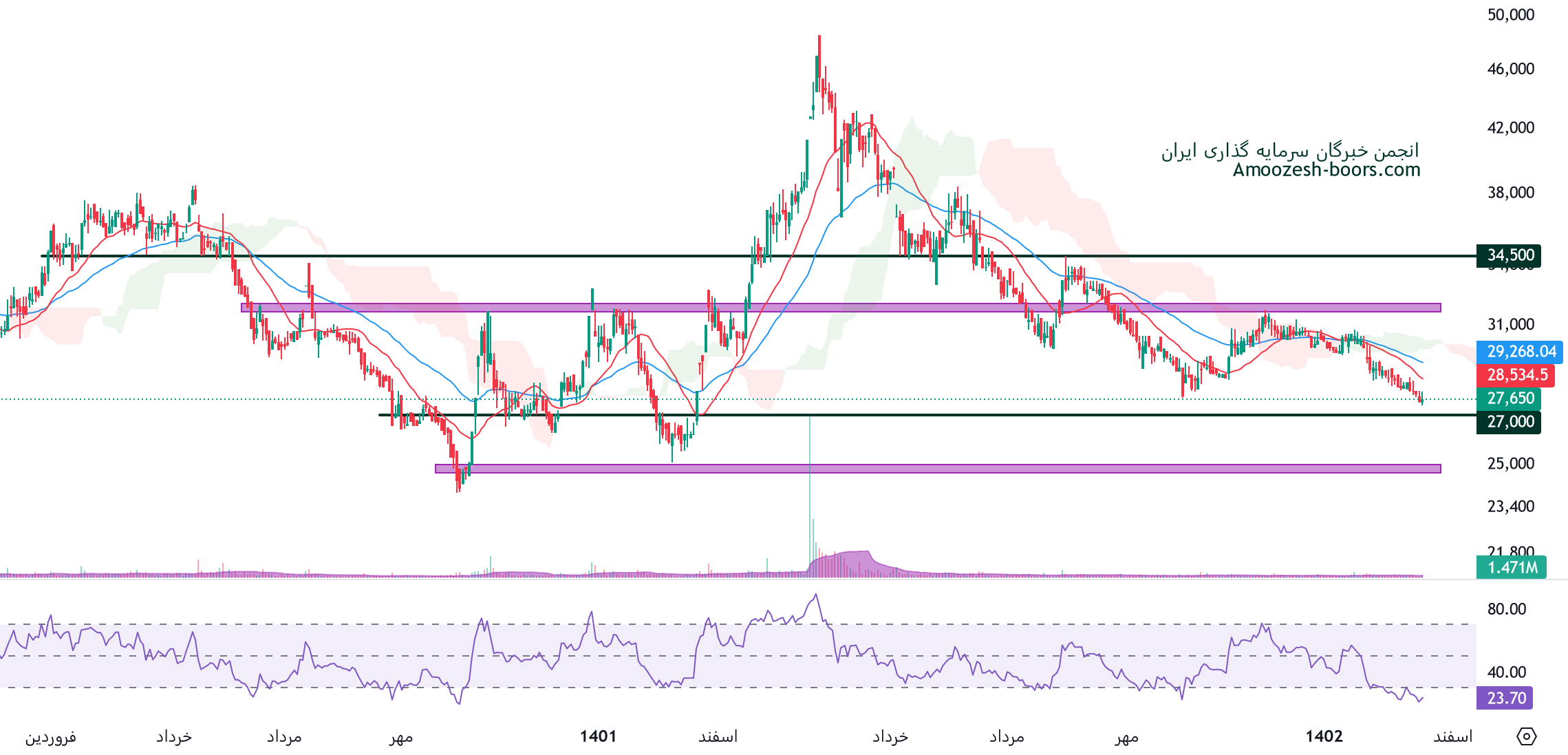 تحلیل تکنیکال سهم شاراک نشان میدهد که قیمت در محدوده حمایتی 27000 ریال و مقاومتی 32000 ریال در حال نوسان میباشد، در صورت شکست هر یک از سطوح، حمایت بعدی سهم شاراک 25000 ریال و در صورت ایجاد فشار تقاضا مقاومت بعدی شاراک 34500 ریال در نظر گرفته میشوند.