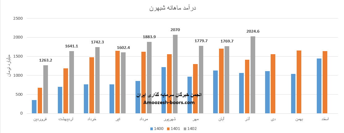 درآمد آبان ماه سال 1402 سهم شبهرن 1769.7 میلیارد تومان بوده است که در مقایسه با ماه گذشته 1% کاهش داشته است.