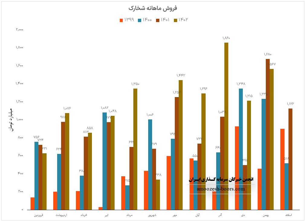 فروش سهم شخارک در این ماه کاهش 10% در مقایسه با ماه گذشته داشته است، همچنین در مقایسه به مدت مشابه 25% و نسبت به متوسط ماهانه 22% افزایش داشته است.