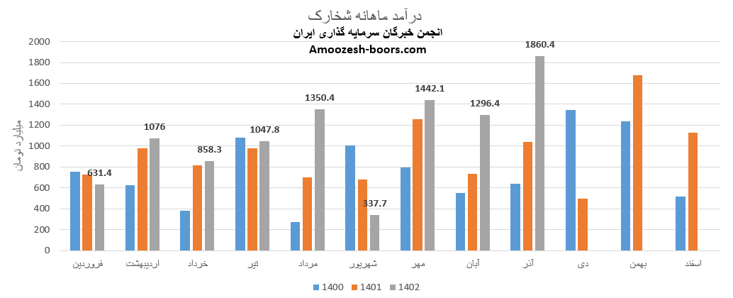 فروش آذر ماه سال 1402 سهم شخارک 1860.4 میلیارد تومان گزارش شده است، تغییرات درآمدی شخارک به شرح زیر میباشد: